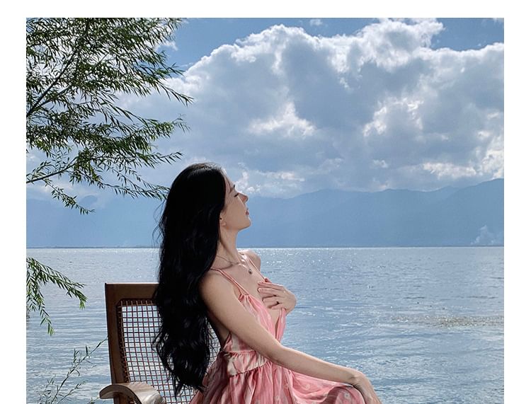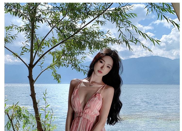 V-Neck Spaghetti Print Floral Dress Maxi A-Line Strap